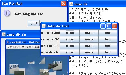フォルダ構造は下の通り|---OuterJarTest.jar(プログラム本体) | |---SameDir.jar(同ディレクトリのJAR) |---SameZip.zip(同ディレクトリのZIP) | |---[other] | |---OtherDir.jar(別ディレクトリのJAR) | |---OtherZip.zip(別ディレクトリのZIP)JARとZIPの中にはそれぞれ別のクラス、画像、テキスト |