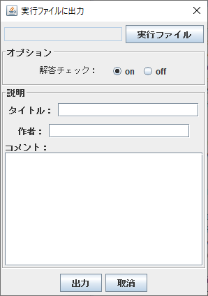 作成した問題を、プレイ専用の実行ファイルとして出力できます。 (内部に問題データを含み、編集用の機能が削除されています) 自作の問題を配布するのに使います。 実行にはJava実行環境が必要なので、配布の際には、 ダウンロードのページにでもその旨を書いておくといいです。 メニュー[入出力]-[実行ファイル出力] 最初に自動でエラーをチェックします。 エラーが無く問題が完成していればダイアログを表示します。 (解答まで入力されていないといけません) ![]() ファイルを指定して出力します。 拡張子は、このプログラムと同じ「*.jar」です。 下の情報を付加できます。 <タイトル> ウィンドウのタイトルバーに表示されます。 未指定の場合はファイル名が代わりに使われます。 <作者、コメント> メニュー[ヘルプ]-[情報]で表示されるパズル作者情報です。 不要なら未指定でかまいません。 プレイ専用ファイルには、解答チェックの機能を付けられます。 正解(入力した答えが解答に一致している)かを確認する機能です。 メニュー[編集]-[解答チェック] ・データの保存について プレイ専用ファイルでは、 終了時に、入力された解答データを自動で保存します。 同じフォルダ内に下のファイルが作られます。 [ファイル名(拡張子除く)]_sol.csv 次の起動時には、これが自動で読み込まれることになります。 ・注意点 プレイ専用ファイルの名前を変えても、内部の設定は変わりません。 なので、自動保存される解答データファイルの名前も変わりません。 動作に問題は生じませんが、ファイル名がズレてくるので要注意です。 |